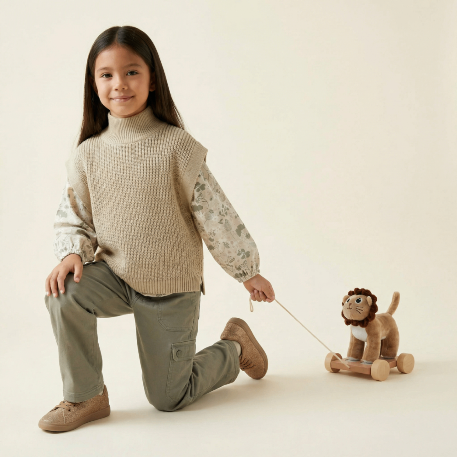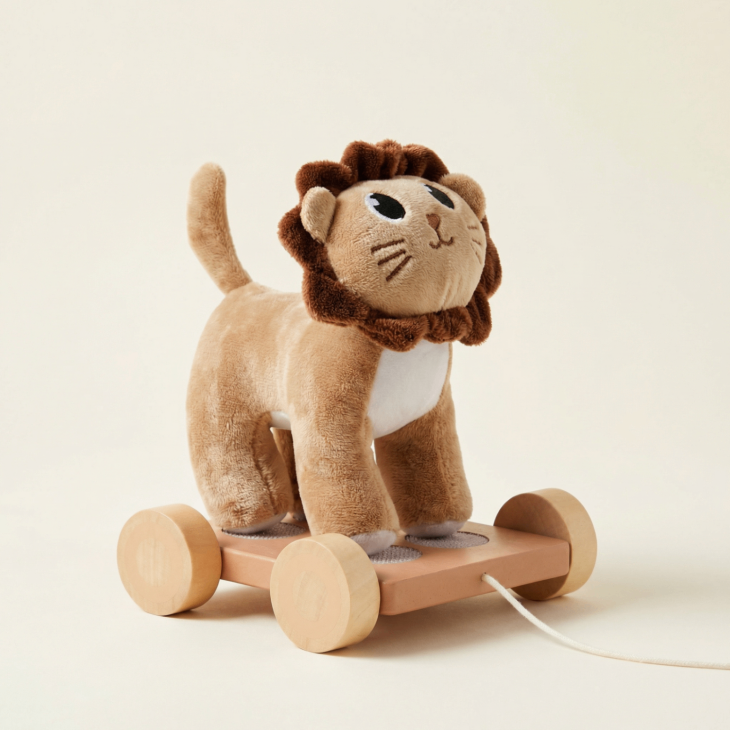Minikler için sevimli bir ilk arkadaş: Mini Matters “Wooden Pull Along Plush” aslan, ipinden çekilerek hareket eder ve yürümeyi/koordinasyonu destekleyen eğlenceli bir oyuncaktır.