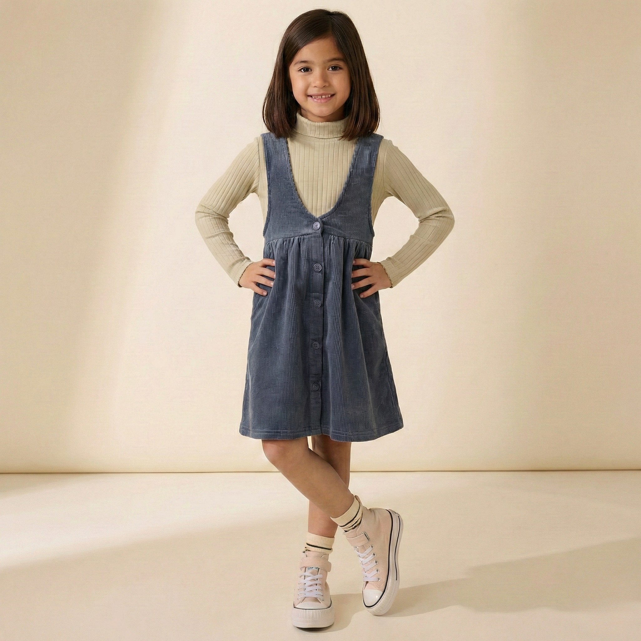 kız çocuk fitilli kadife dokulu salopet etek ve boğazlı bluz seti; şık düğme detayları ve yumuşak dokusuyla günlük kullanımda ve özel anlarda konforlu bir görünüm sunar.